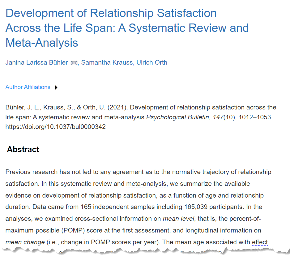 A study titled “Development of Relationship Satisfaction Across the Life Span: A Systematic Review and Meta-Analysis” was published in the Psychological Bulletin in 2021 by Janina Larissa Bühler, Samantha Krauss, and Ulrich Orth. The main results are: