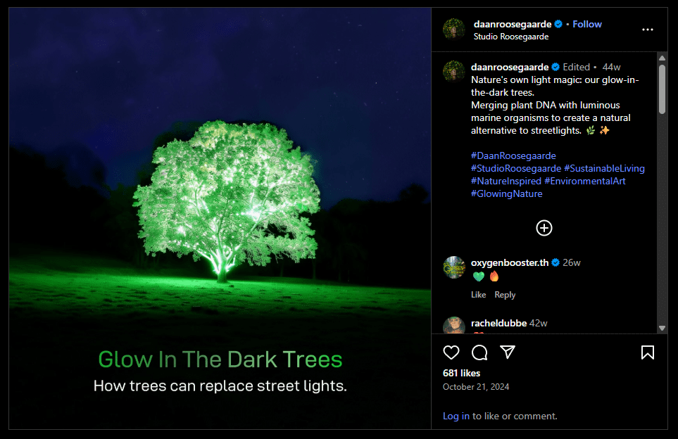 A real world pilot in the Netherlands used photoluminescent road markings that absorb daylight and glow for hours at night. This shows the studio’s practical work with light in public space, separate from the idea of genetically glowing trees.