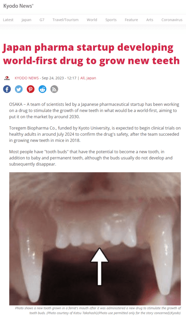 Read the article : https://english.kyodonews.net/news/2023/09/d56fb464a52b-japan-pharma-startup-developing-world-first-drug-to-grow-new-teeth.html